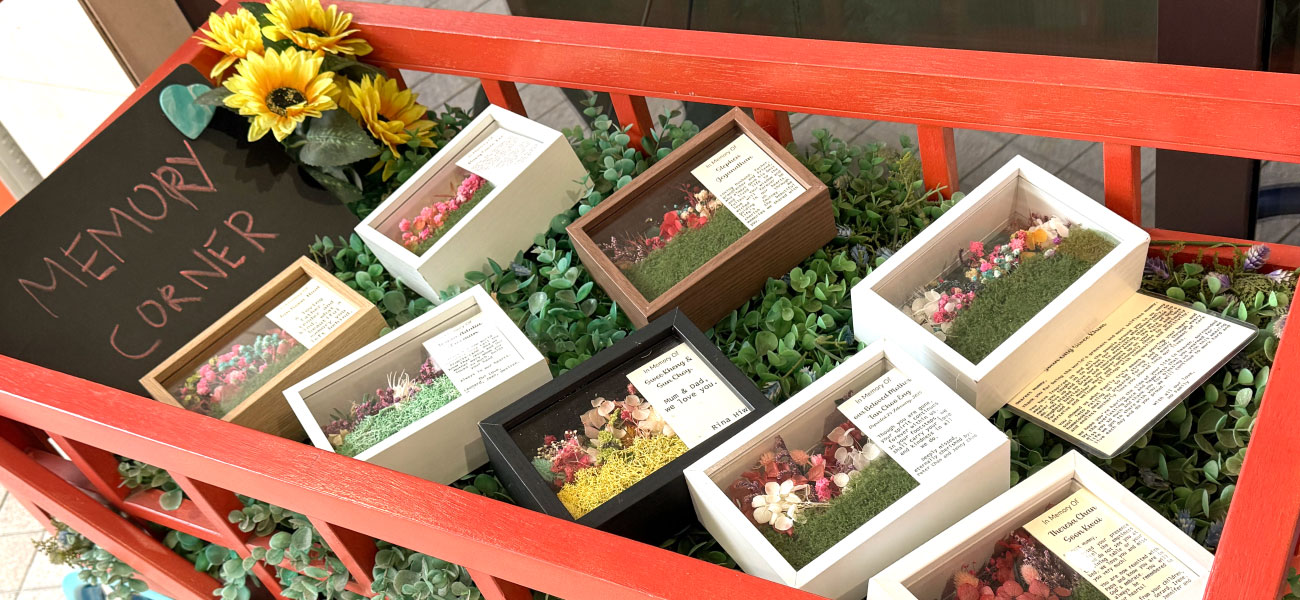 With a minimum donation of $1,000, you can dedicate a special flower to your loved one by personalising it with his or her name. You can add the flower to the special flower trolley at the Memory Corner personally on an arranged date. The flower will be on display for 4 months and returned to you for keepsake by mail.
